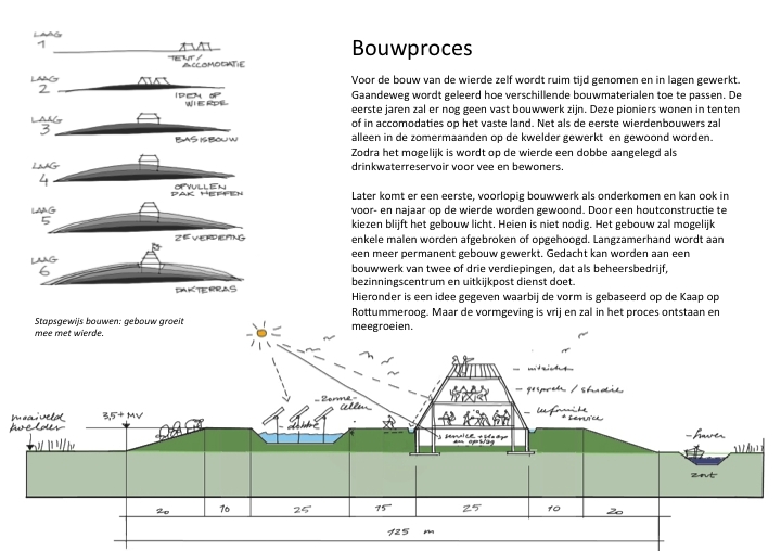 Door elkaar opvolgende verschillende groepen mensen wordt in een periode van vele jaren tijd een nieuwe terp gebouwd. Begonnen wordt met een tijdelijke bewoning in de zomermaanden in tenten. Later worden een (semi)permanent bouwwerk gecreƫerd.